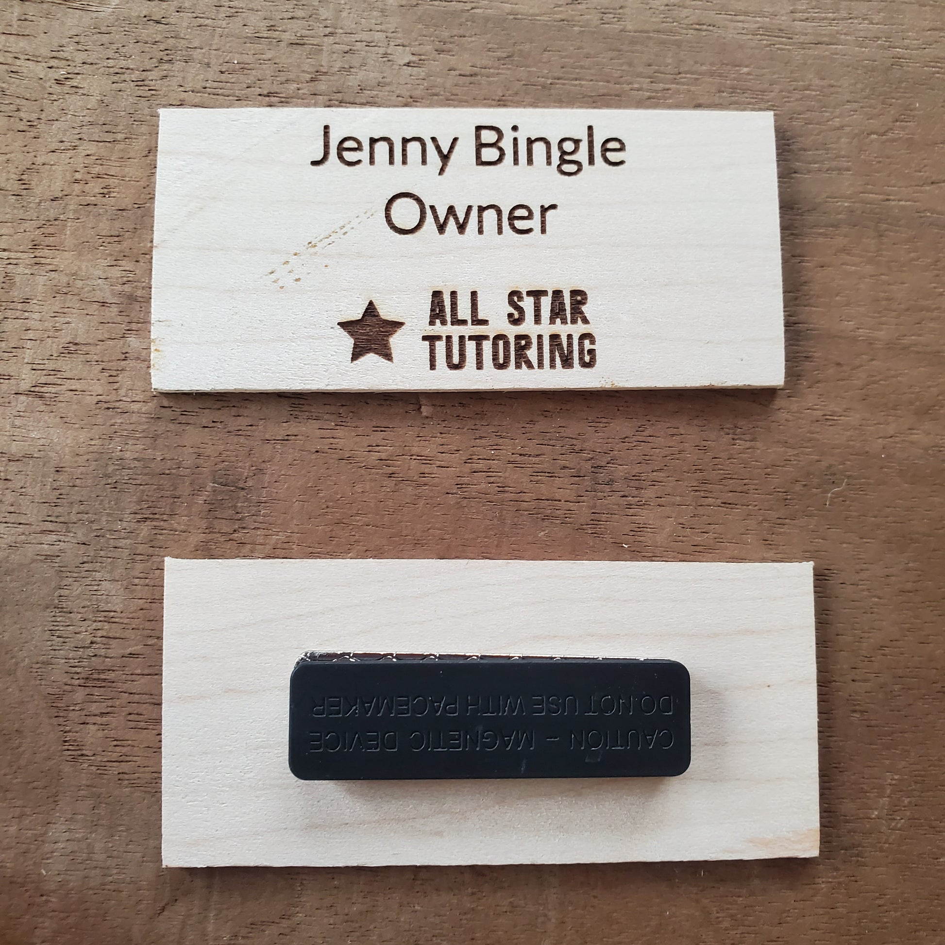 Wood name tags. Made from wood diverted from the landfill. Sustainable and reusable. Attaches via two piece magnet. Customize with your own text, logo, and/or images. Choose your own font, size, graphics, and shape.